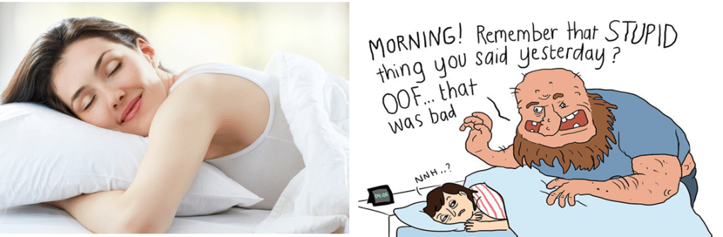 It is very rare that someone who experiences social anxiety will just pop off to sleep nice and relaxed, mind empty of negative thoughts. It is much more likely to be like the picture on the right, waking up in the middle of the night thinking back on something they said the day before and worrying about what the other person(s) thought about it. It can be sometimes really hard to get off to sleep when your mind is going 1000 miles per hour thinking over and over and analysing from almost every conceivable angle something you said or something someone said to you. You’re then jumping to what you have ahead of you tomorrow and how you’ll cope with being around people. Is it any wonder with that much going on in your mind that it can be hard to wind down and get to sleep!
